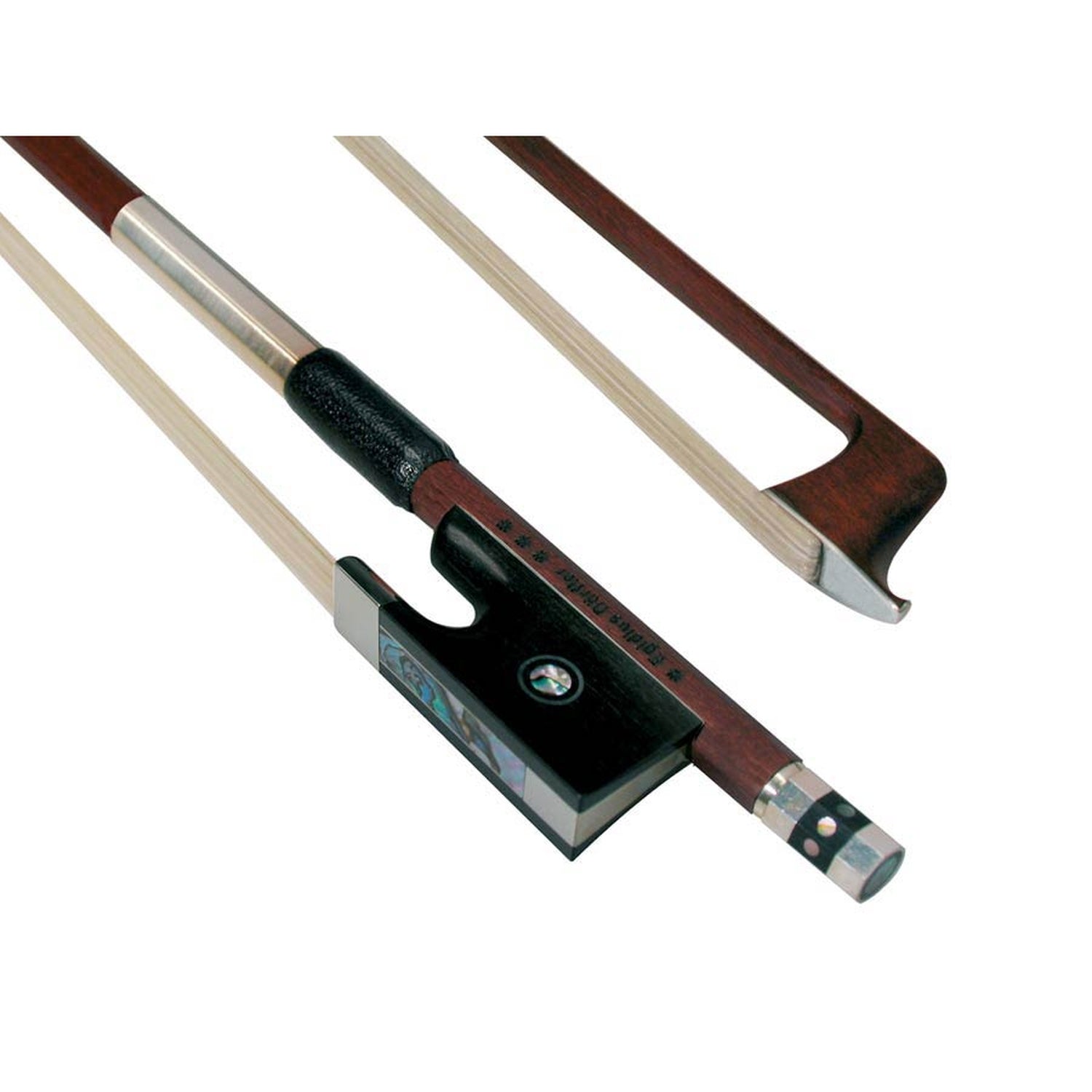 Der runde Bogen verfügt über eine silberne Spitzenplatte und einen erlesenen Ebenholzfrosch mit poliertem Schieber und elegantem Pariser Auge. Die dreizinkige Ebenholz-Endkappe mit nicht weniger als acht eingelegten Perlmuttaugen verleiht diesem Bogen ein einzigartiges, luxuriöses Aussehen. Die Silberdrahtwicklung sorgt für ein ausgewogenes Gewicht und erhöhten Spielkomfort. Jeder Bogen wird in Handarbeit mit höchster Präzision gefertigt und veredelt, was den DV23 zu einem musikalischen und optischen Meisterwerk macht – die perfekte Wahl für alle, die nur das Beste akzeptieren.