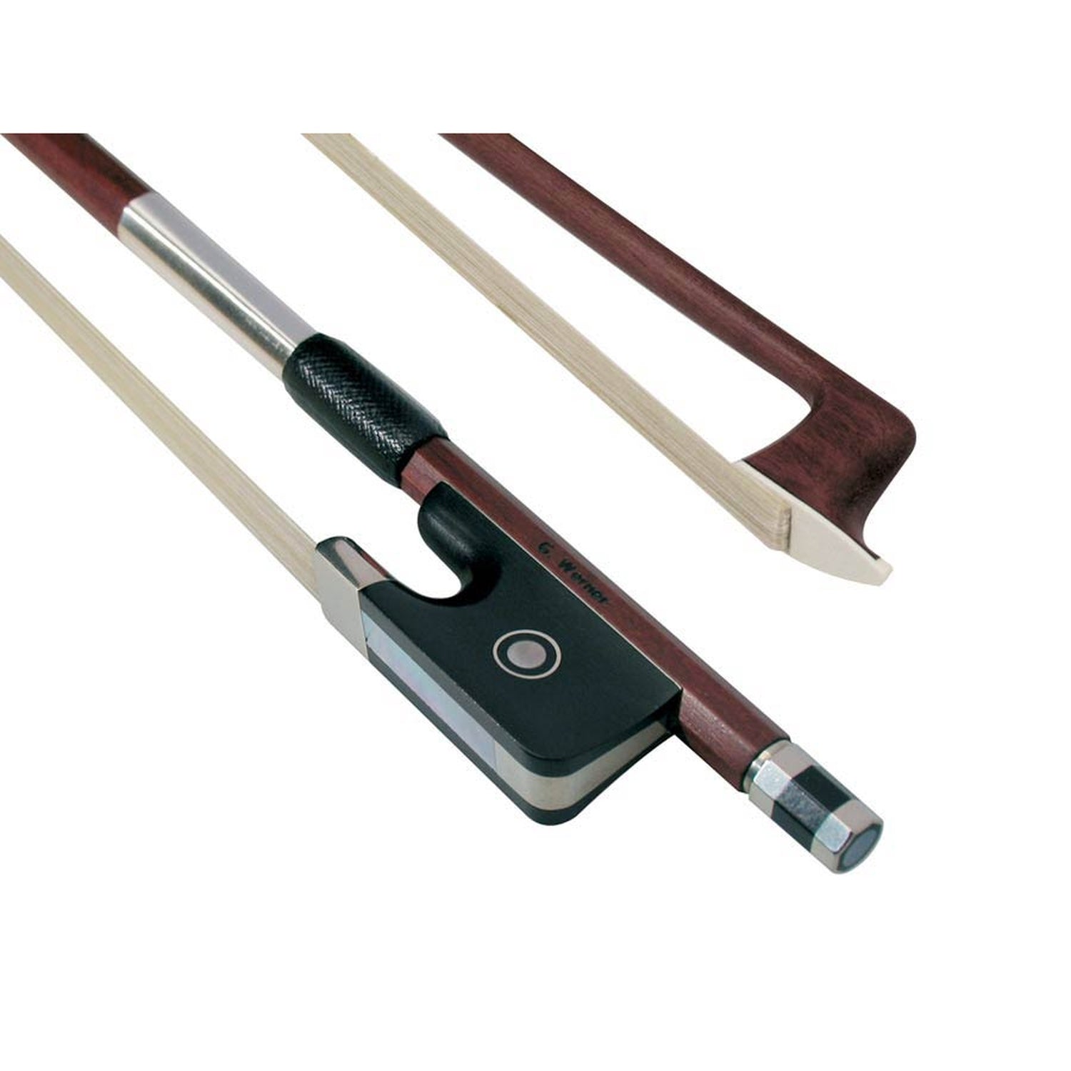 The round bow is elegantly finished with an ebony frog featuring a heel plate and a stylish Parisian eye. The high-quality metal winding and the three-piece button with eye not only create a harmonious appearance but also ensure durability and comfortable handling. As part of Dörfler's top-of-the-line bow, this is ideal for advanced and professional violists who want to get the most out of their instrument, while respecting traditional craftsmanship and sustainable wood use.